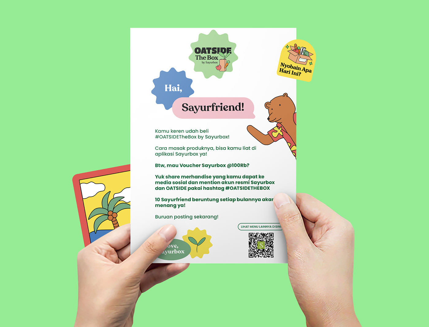 We combine OATSIDE with Sayurbox products to create exciting oat-based flavors. Expert chefs blend fresh ingredients into unique creations. #OATSIDEtheBox by Sayurbox invites you to try something new and fun! We’re also create collectible items for costumer.